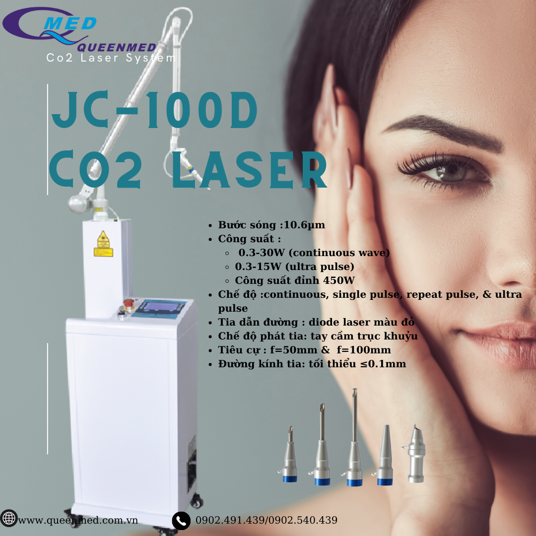 - Máy LASER JC-100D là máy Laser CO2 có độ dài sóng 10,6um, có mô đích là nước. Khi chiếu tia Laser vào thương tổn ở da, ánh sáng được nước hấp thu sẽ chuyển thành nhiệt, làm bốc hơi hoặc cắt mô. Laser CO2 có thể định vị tổn thương cực kỳ chính xác vì chỉ chiếu đúng vào tổ chức cần loại bỏ.